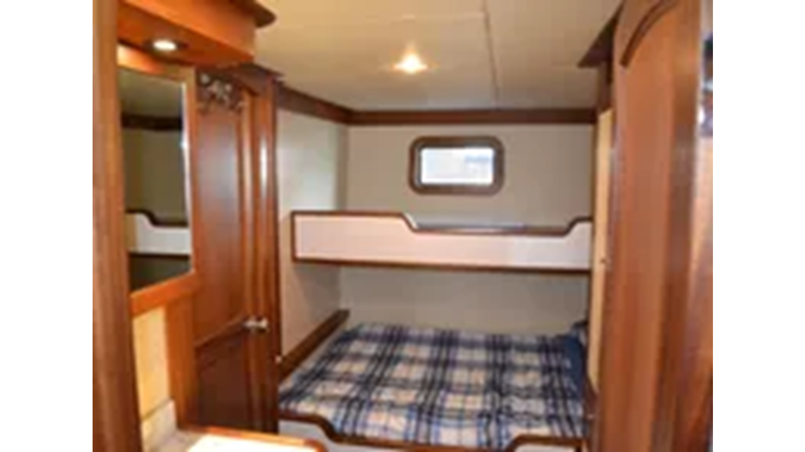 Crew Quarters are located forward of the engine room, level one. One double and one twin berth, counter tops with storage cabinets, bathroom with marble shower.