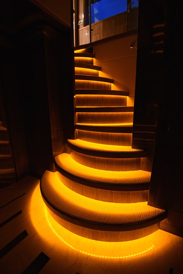 European styling and full wrap-around windows create breathtaking views from every angle. Sophisticated details like Cream Kaduna marble, gloss walnut cabinetry, and custom finishes elevate the onboard experience.