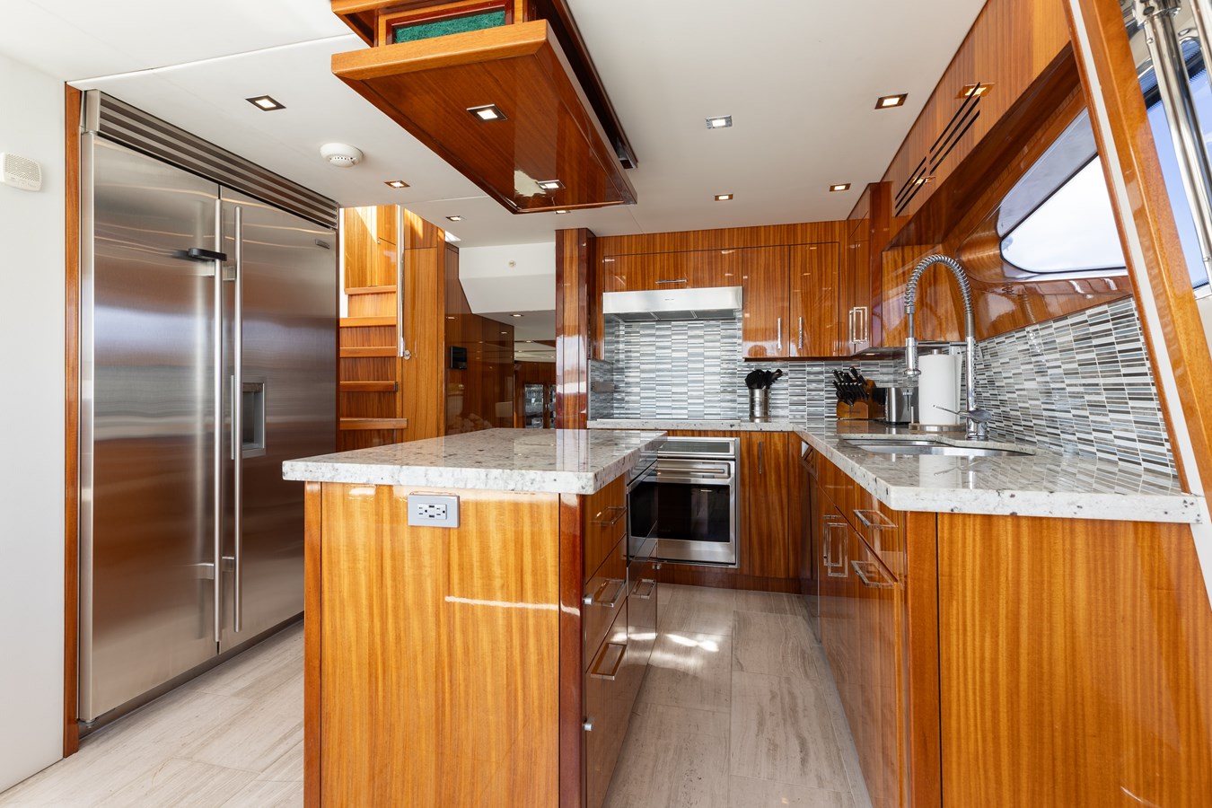 From the dining area going forward you enter the large well appointed Galley with a island counter and full size appliances for all the comforts of home. The forward portion of the galley is a large settee for casual conversation with the chef and light meals.