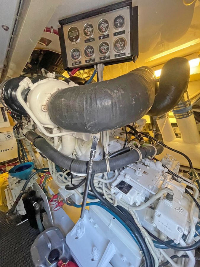 This 68-foot Hatteras offers luxury and performance with twin Caterpillar C32 engines (1600 hours) running on diesel. Equipped with two Onan 27.5 KVA generators and a watermaker, it ensures excellent autonomy at sea. Featuring 3 cabins, 4 bathrooms, a spacious salon, a fully equipped kitchen, and all necessary navigation equipment.