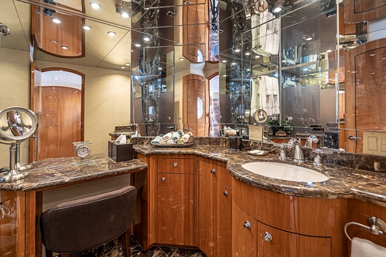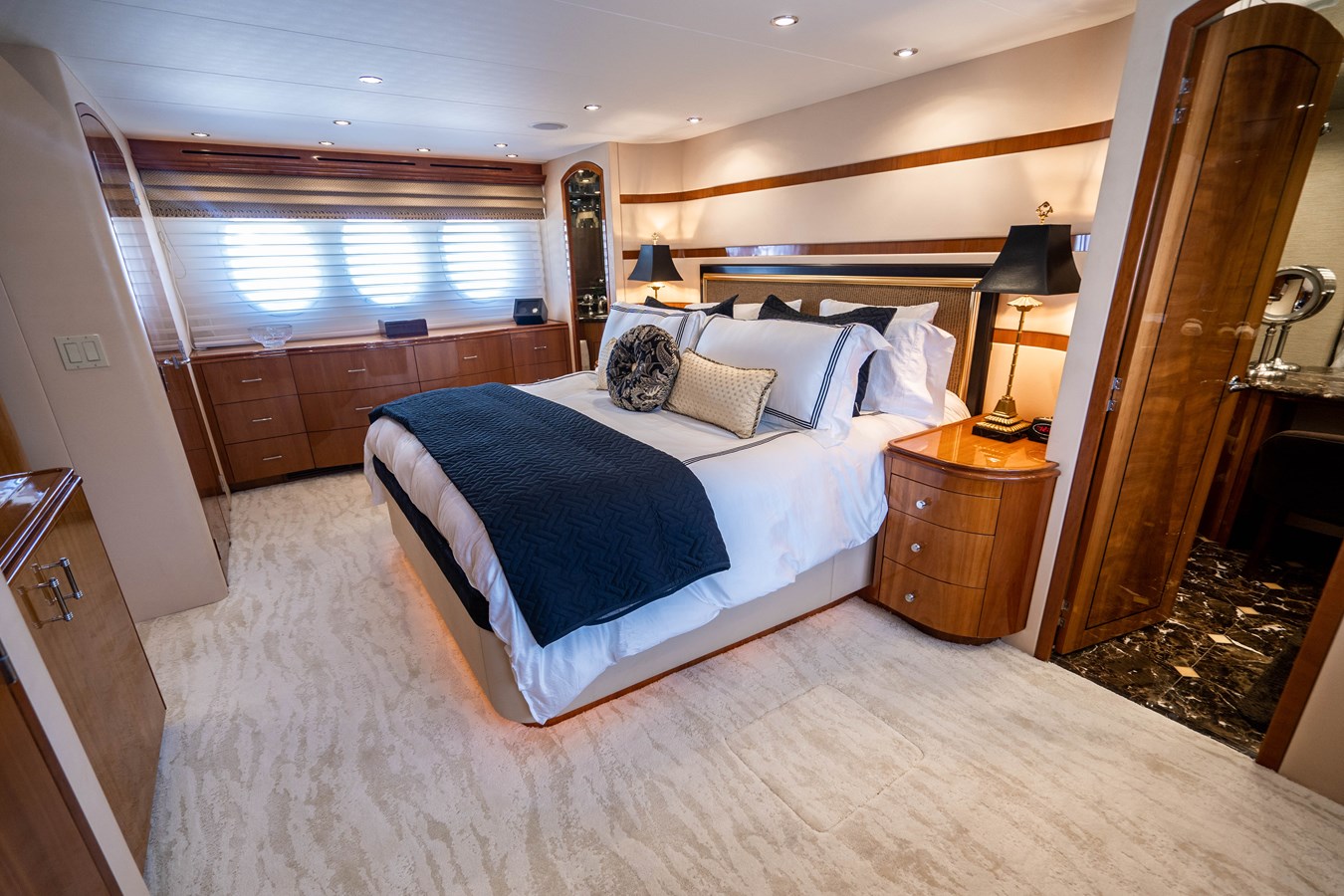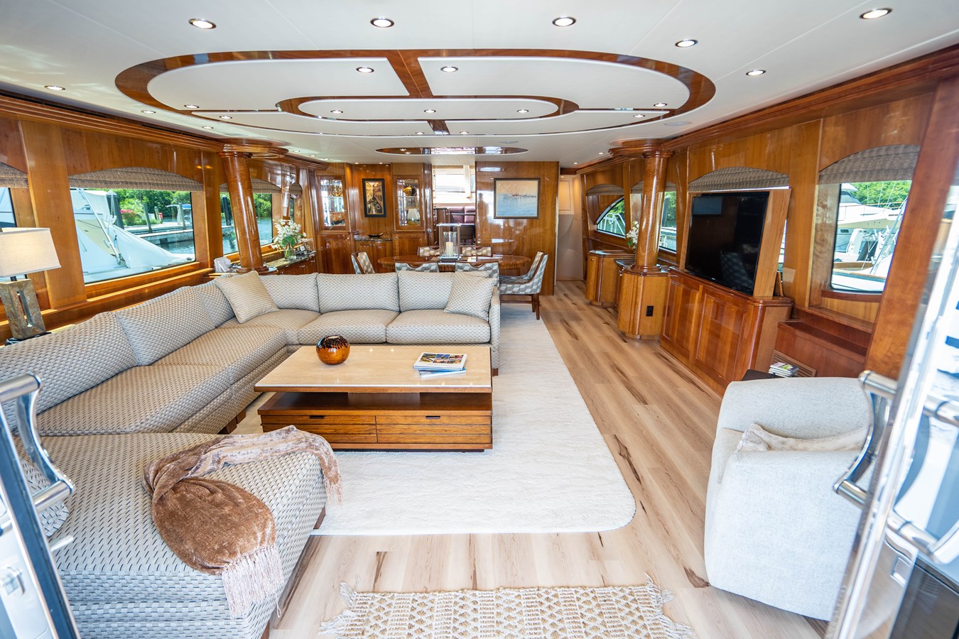 Entering the main salon from the aft deck it quickly becomes apparent you are about to inspect one of the finest 80' Hatteras motor yachts ever built. Her custom joinery features a high gloss cherry wood with a detailed overhead wood design, entertainment center with a 50” HD TV on a lift to starboard and a custom upholstered sofa to port. Forward in the main salon is a formal dining table with seating for (6) guests, custom built-in china cabinets on the forward bulkhead, port and starboard buffet cabinets with marble tops and a custom wood soffit w/ lighting over the table. All flooring, headliners and most furniture was new in 2022.