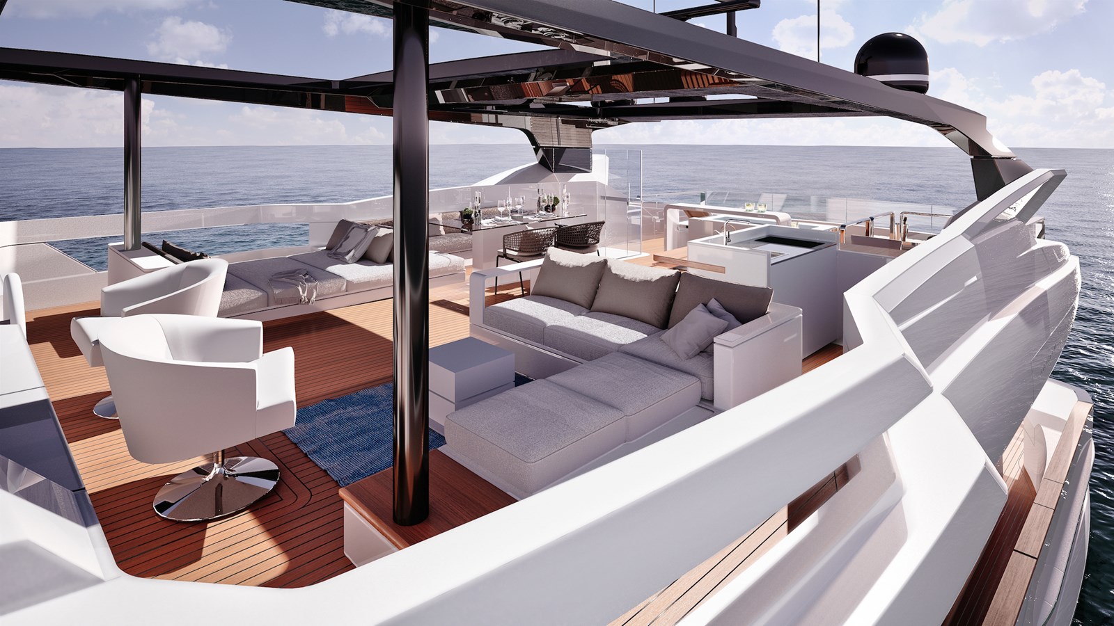 The design team has created 4 major exterior areas to offer you and your guests the perfect experience: a 63 sqm flying bridge, one of the largest in her class, a 22.5 sqm foredeck lounge with seating area, infinity sun loungers, and a versatile space for yoga, a treadmill or even a driving range, a 21 sqm alfresco cockpit with a dining table and sun lounger and a 21 sqm sea-level beach club with an aft rotating platform and two side balconies.