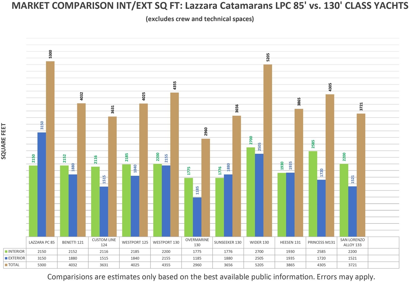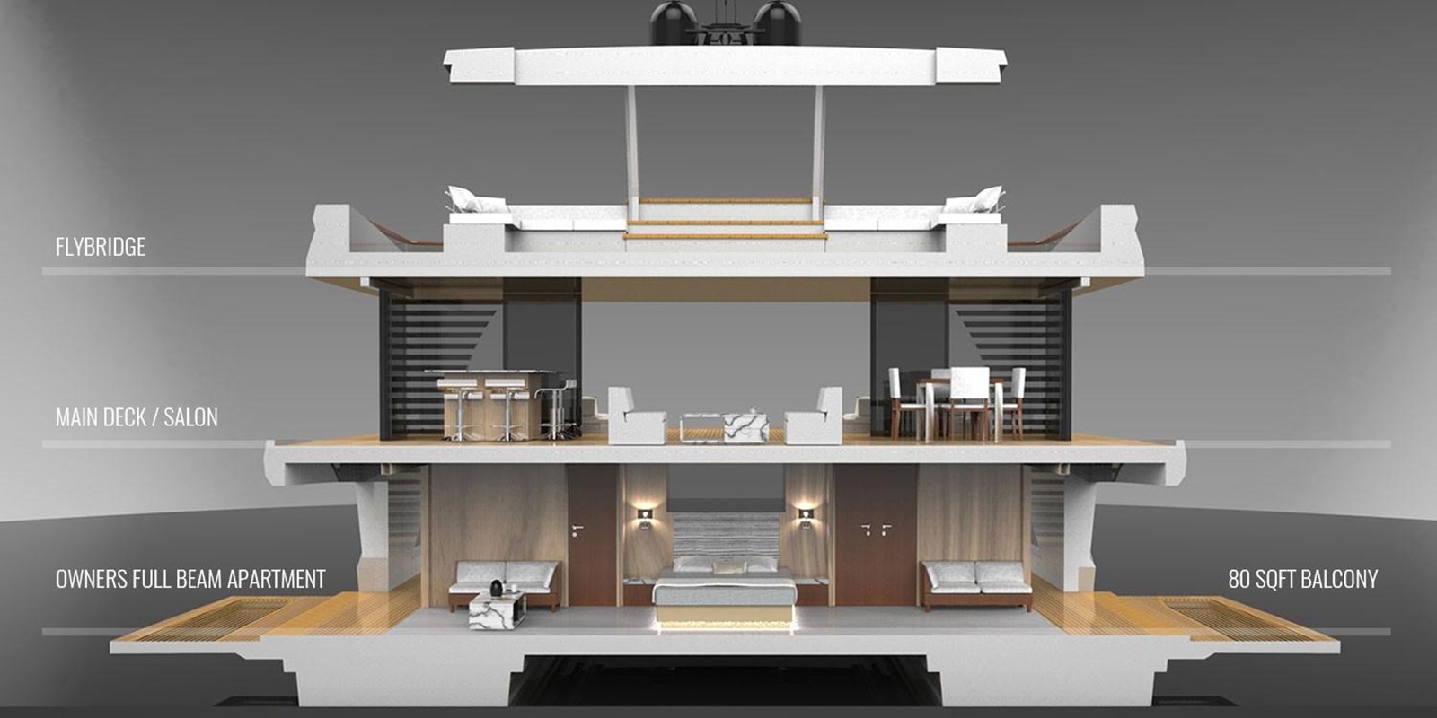 Our patented new multihull Lazzara Catamarans design platform creates more square footage in 85 feet than what is typically found on a 130-foot monohull yacht. The lower deck is designed to take advantage of the full beam of the yacht, ensuring that your master suite and guest staterooms are among the most spacious of any in its class. The Lazzara Catamarans design is both more efficient to operate and more modest in purchase price than comparable yachts. It permits owners to spend more time on board with family, friends, or simply their own thoughts. Additional time and space that invite you to enjoy every moment on board will prove that a Lazzara Catamaran delivers the freedom to live the yachting lifestyle of your dreams.