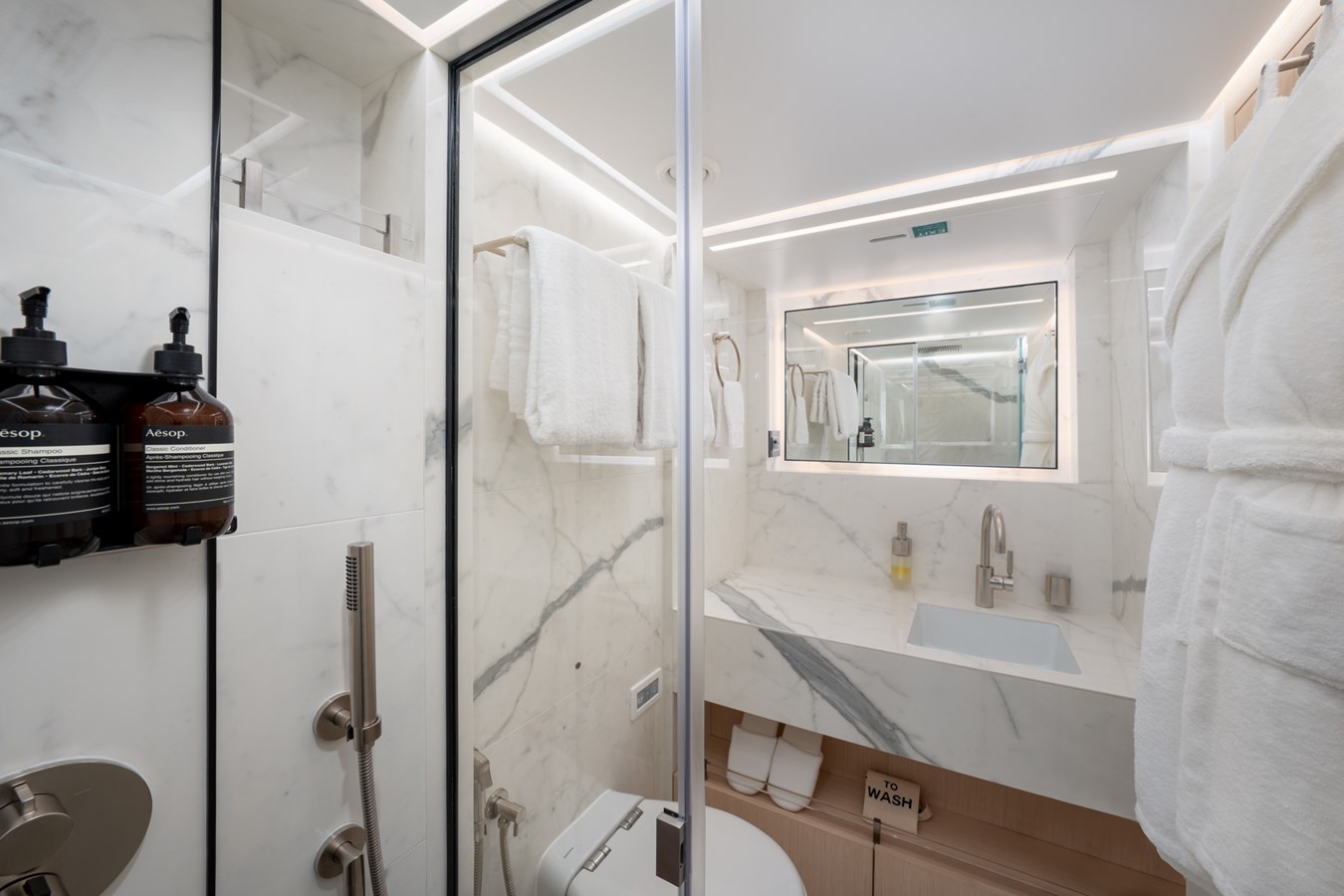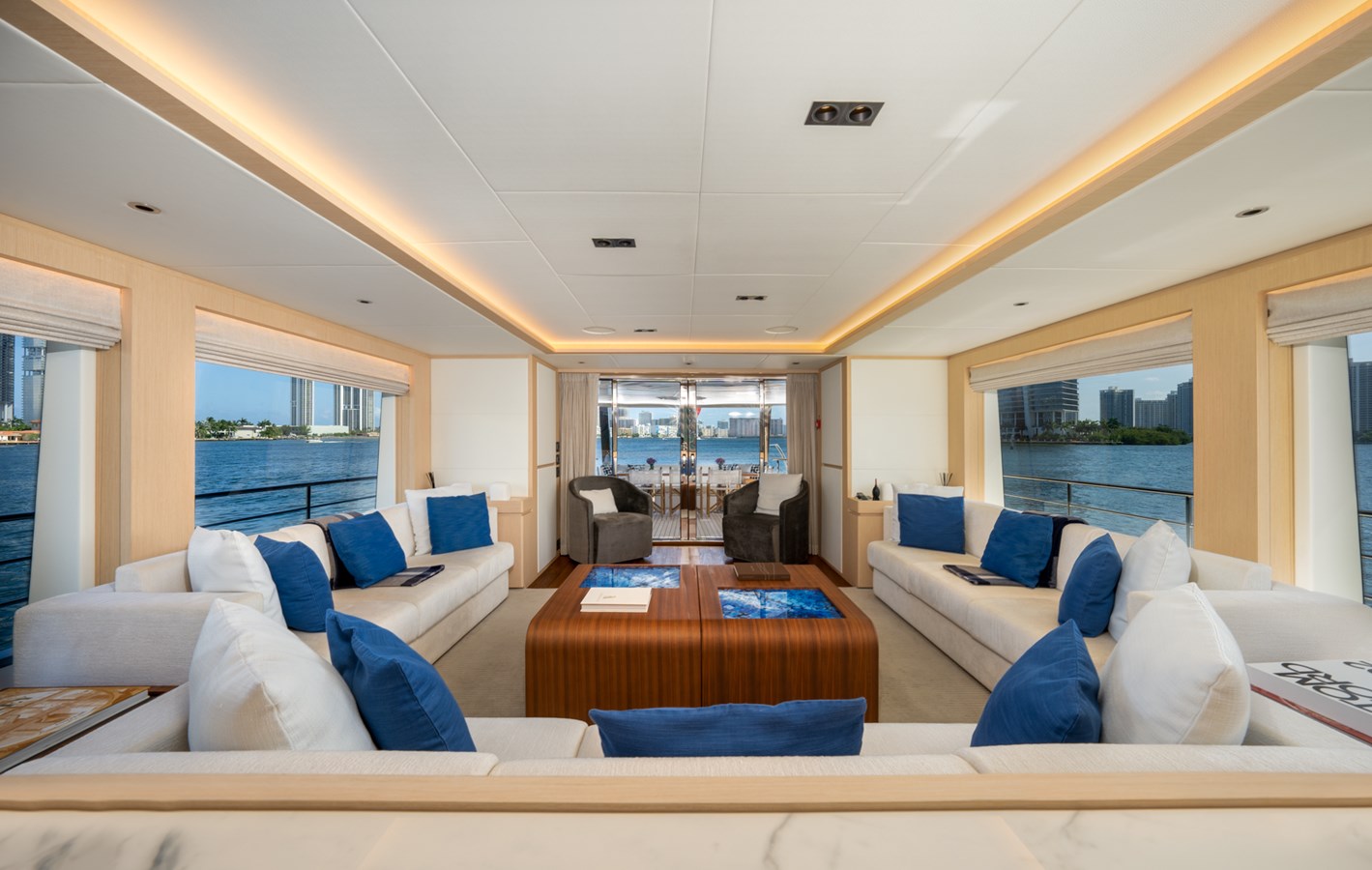 SANTOSH represents an amazing opportunity to purchase a very well-equipped, and very lightly used Gulf Craft Majesty 100. With a custom interior made of light colors, floor to ceiling windows and large glass doors, the transfer from interior to exterior spaces is seamless.