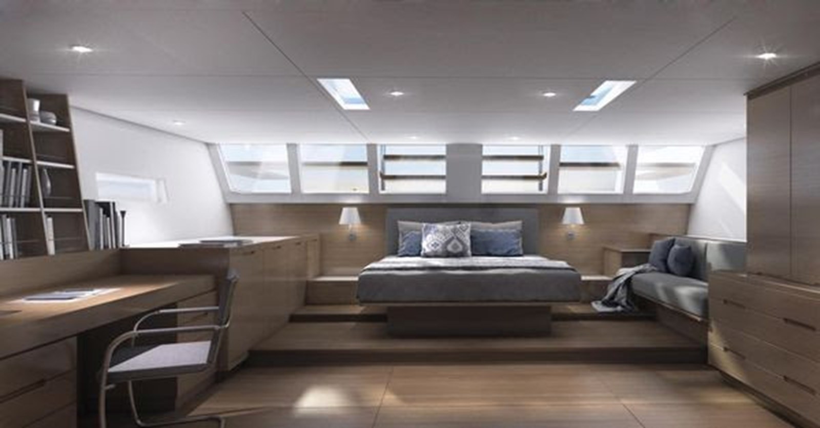 A deck area between the turnstiles has been designed aft of the Cockpit Saloon to give ample room for manoeuvres during social sailing or a regatta. At the stern, the project includes a terrace by the sea protected from the wind and sun by a retractable Bimini awning, where cushions and benches give free rein to the imagination of a life full of peace contemplating the wake of the boat cutting through the blue sea disappearing into the distance without any noise, without stress... In the same space, large windows aft of the master cabin give an external touch to the immensity of the internal cabin, giving the owner a unique space on a boat of this size.