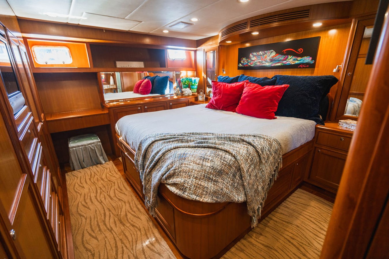 GUEST STATEROOM #2 This area could be used as an office or as a third stateroom. with a built in desk and high low single berths that convert to a settee. There are cedar lined hanging lockers, built in 15" LCD TV, Direct TV receiver, radio and DVD player, halogen overhead Cantalupi lighting with dimmer control & berth lighting, padded soft vinyl removable headliner, Manship high polished stainless steel opening along with a teak & holly floor.
