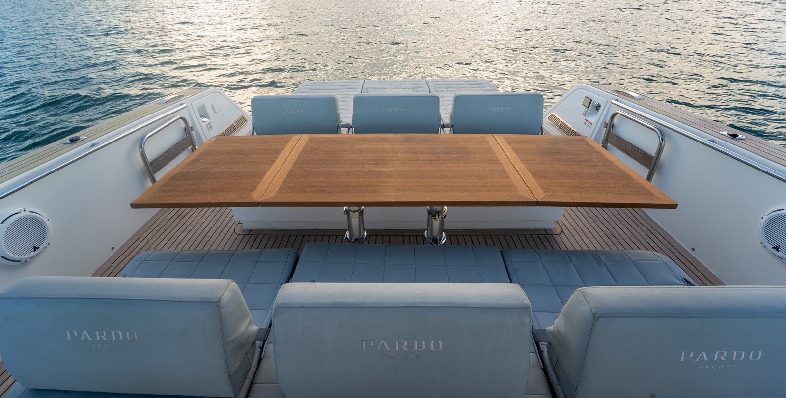 Entertaining layout: Large aft lounge/dining area, extendable table that converts to sunpad, forward sunbed with bench seat.