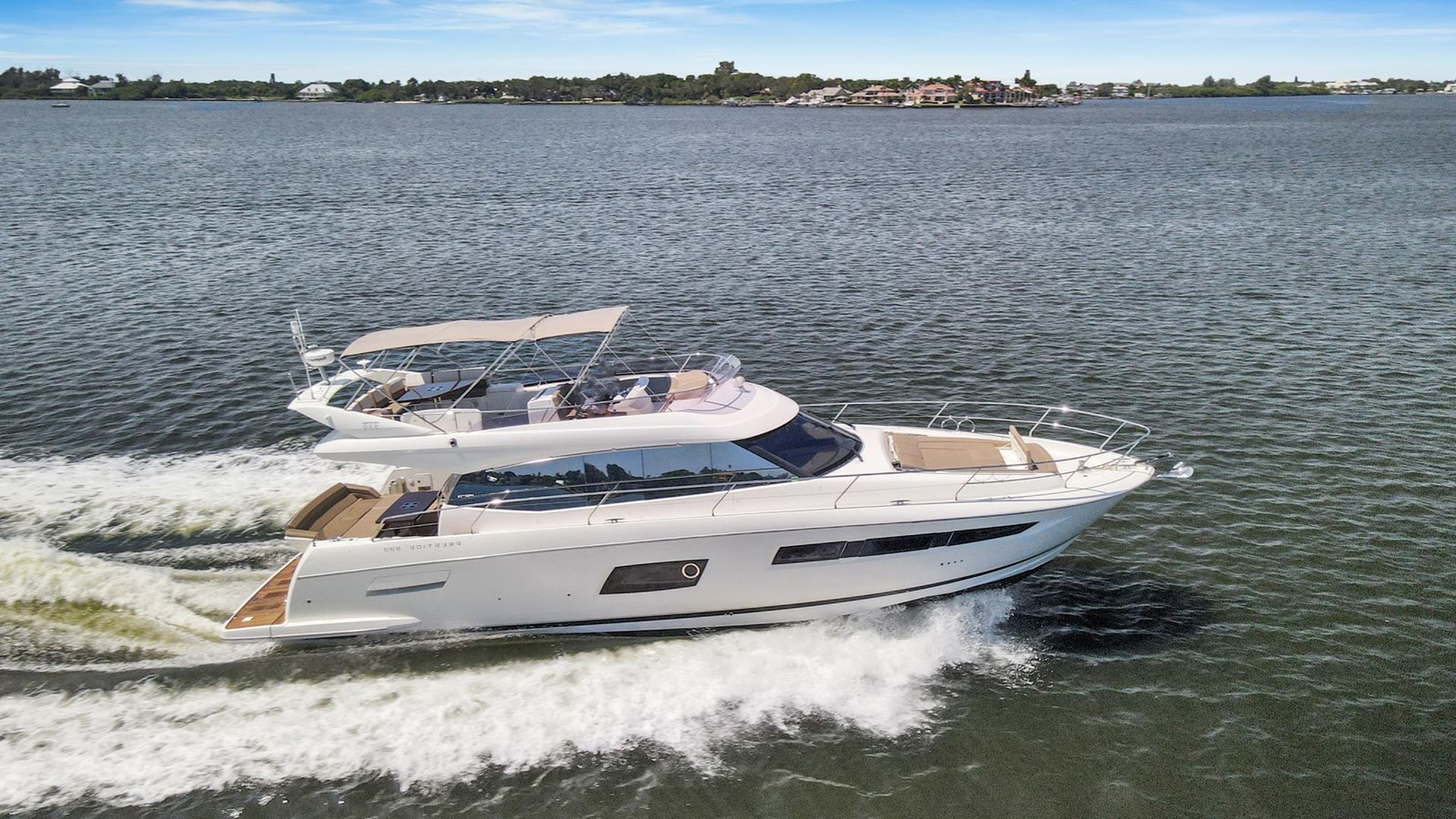 Explore Luxury on Water with this Unique 2015 Prestige 550 Flybridge Motor Yacht with Soft Top Bimini and Seakeeper 9