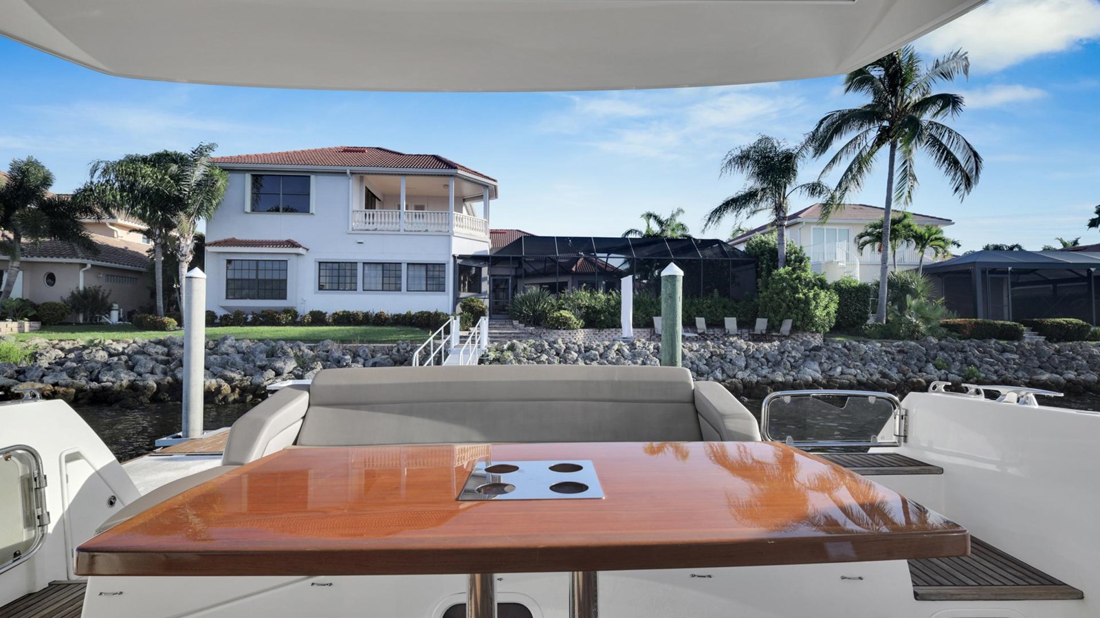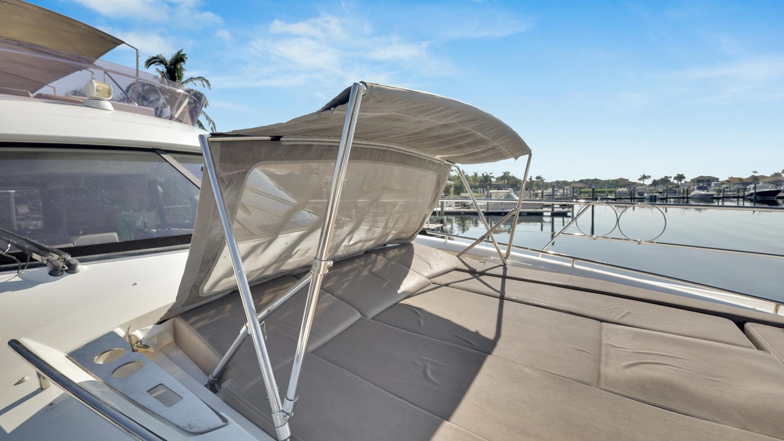 Ascend to the impressive flybridge, where breathtaking vistas and unparalleled freedom await. Equipped with soft top bimini, this open-air deck provides the perfect sanctuary for entertaining guests or enjoying serene sunsets with your loved ones. Revel in the sea breeze as you savor unobstructed views of the surrounding beauty.