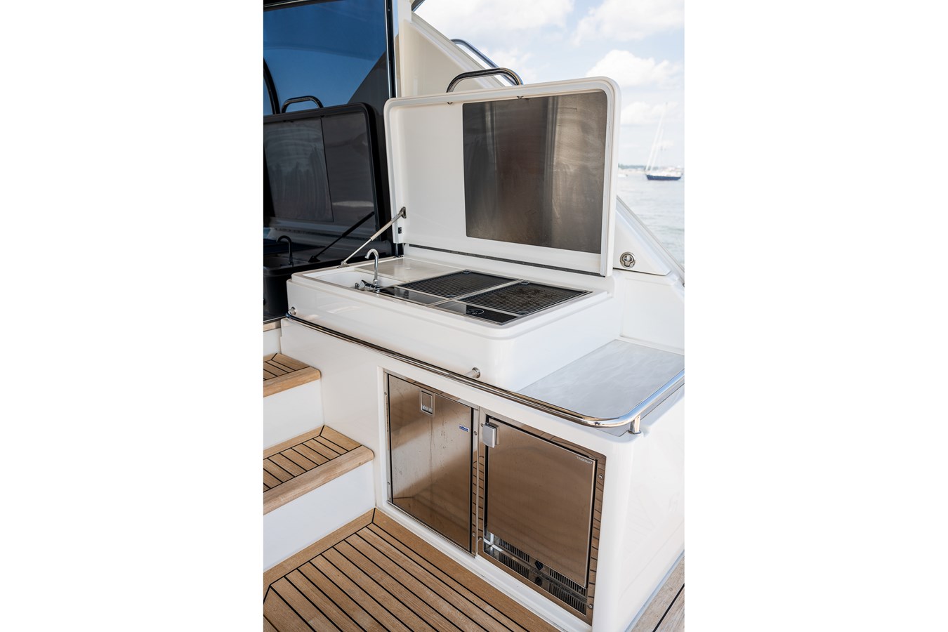 Starting at the stern, the swim platform has tender chalks and a fold out swim ladder. Rather than just sitting flush when in the up position, it also can come up several inches to bring the platform further away from the water when in rough seas. A tuna door and folding coaming makes entrance to the cockpit easy. The boat can be fished hard with a recirculating livewell, rod holders, cockpit flood lights, and wash downBut it is just as outfitted for entertaining with a forward-facing aft bench seat, L-shaped mezzanine seating, and wet bar featuring sink, double grill, refrigerator, and icemaker. A fixed awning keeps the sun off the mezzanine area. For ease of docking, the starboard side cockpit houses a concealed docking station complete with joystick, ignitions, and switches).