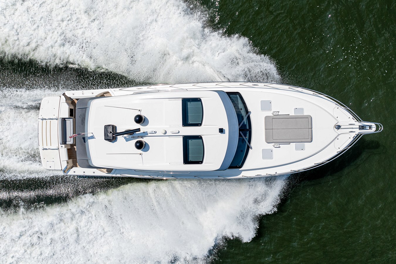 The bow is easily and safely accessed with wide walkways, handrails, and blue LED floor lights. A double-wide sunpad, and cup holders make the bow a very comfortable place to relax. Four deck hatches give natural light and ventilation to the cabins below. There is plenty of foredeck forward of the sunpad for congregating, handling lines and fenders, or storage of bulky items.