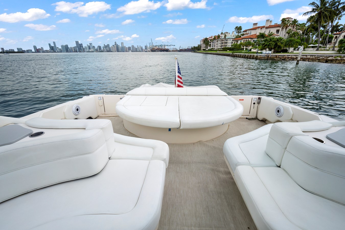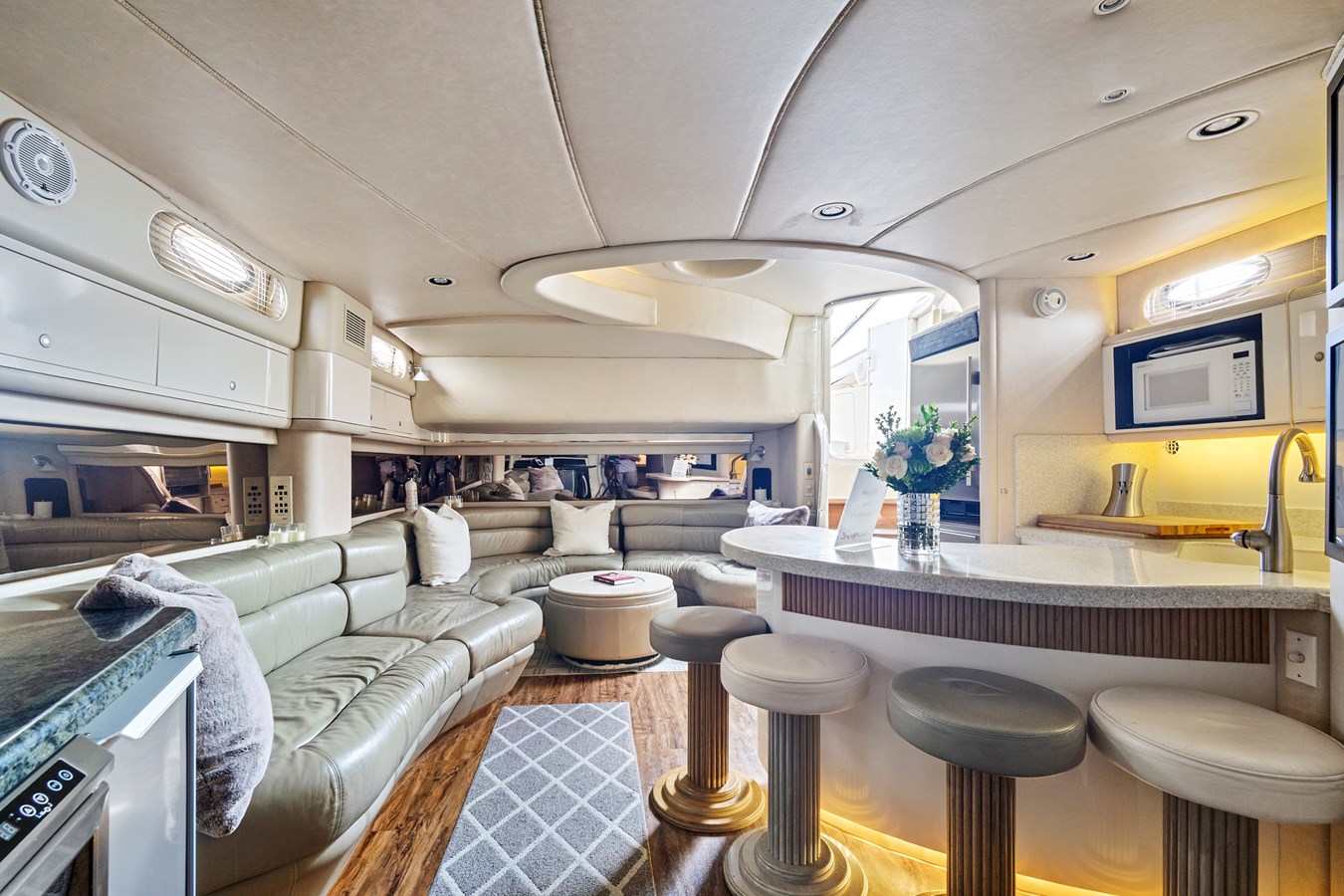Built on a fully cored deep-V hull with a moderate beam, prop pockets, and an integrated transom, Waterbaby is engineered for smooth, confident handling. Her spacious salon features sculpted overhead panels, a sweeping contoured leather sofa, and a convenient day head—ideal for entertaining.