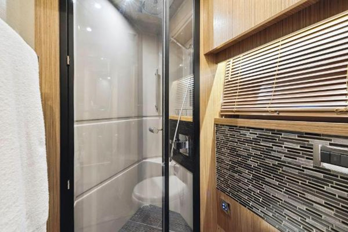 Step into a world of elegance inside GRATITUDE. The salon is a showcase of refined craftsmanship, with lo-gloss wood finishes, premium upholstery, and panoramic windows that flood the space with natural light. The open-concept design seamlessly connects the salon, galley, and dining area, creating an inviting space for entertaining.