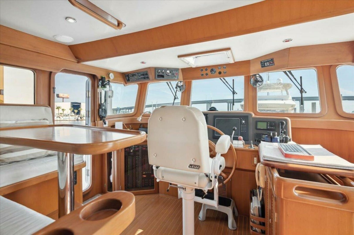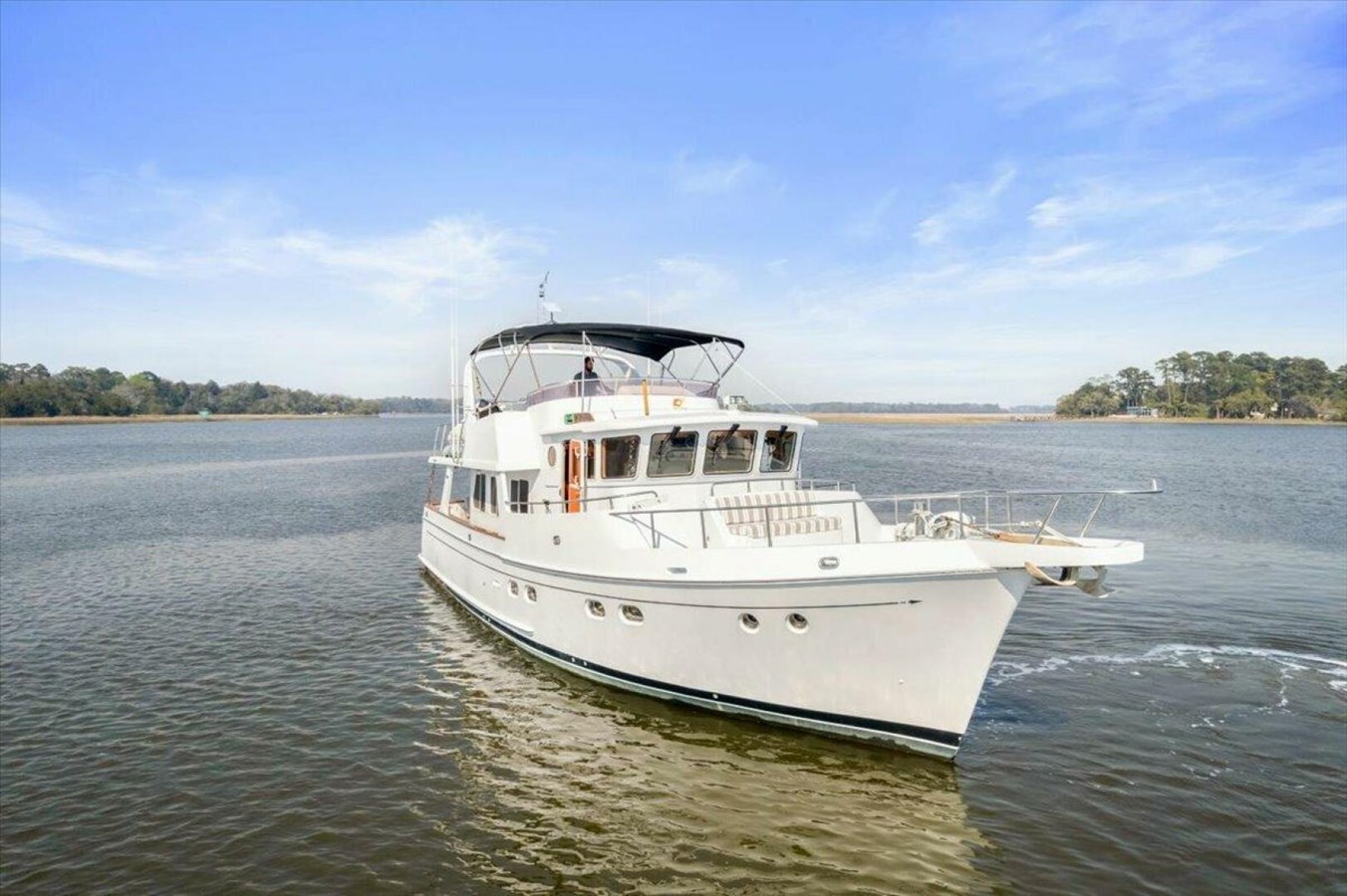 It’s easy to enjoy the outdoors aboard Ho Hum. Hop in the water from the swim platform, relax in a comfortable chair on the covered aft deck during a light rain, bask in the sun on the foredeck, and enjoy panoramic views from the bimini-covered flybridge. The aft deck can be accessed from the salon, the side decks from the pilot house, and the flybridge from both the aft and pilothouse.