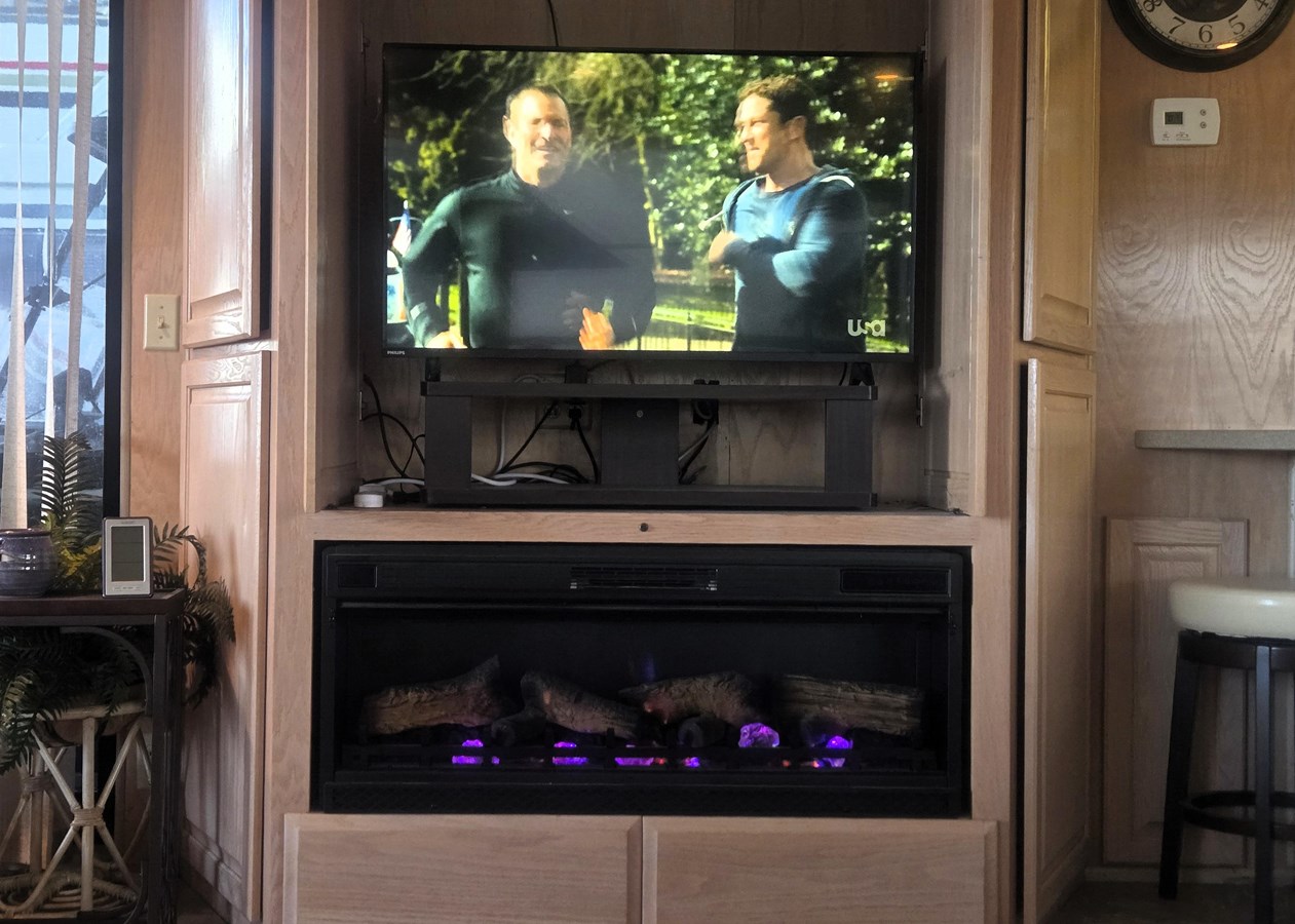 The salon features a large sectional sofa on the port side with a TV and Fireplace starboard. The adjoining dining area features a wet bar with a sink and icemaker and a dining table.
