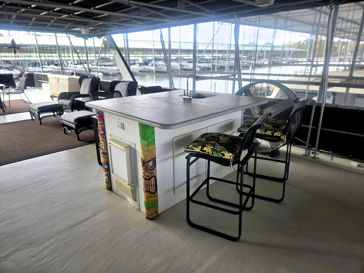 The boat features an open and spacious galley with a newer side by side refrigerator/freezer (2021), a 4 burner range/stove combo, microwave, wine cooler and dishwasher.